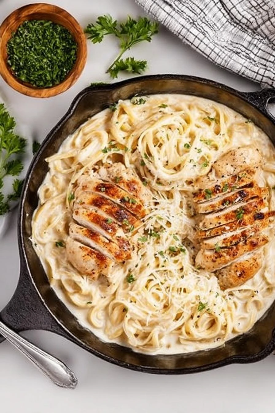 Fettuccine. The wide noodles hold sauce better than thin ones. Chicken breasts, pounded so they cook evenly. Uneven = some parts dry, some parts raw. Don’t skip this step. Oregano’s your flavor backbone here. Fresh is fine, dried works just as well—honestly tastes the same cooked down. Salt goes in twice, split between the chicken and the sauce. Matters. Olive oil for searing. Butter for the garlic. Garlic powder too, sounds weird but it rounds out the fresh garlic bite. Flour for the roux. Whole milk and heavy cream mixed—don’t use all cream or it breaks. Freshly grated Parmesan. Not the green can. Tastes like sawdust. Parsley at the end because white sauce needs color. Optional but the smoked paprika in the chicken seasoning adds depth without being obvious.
