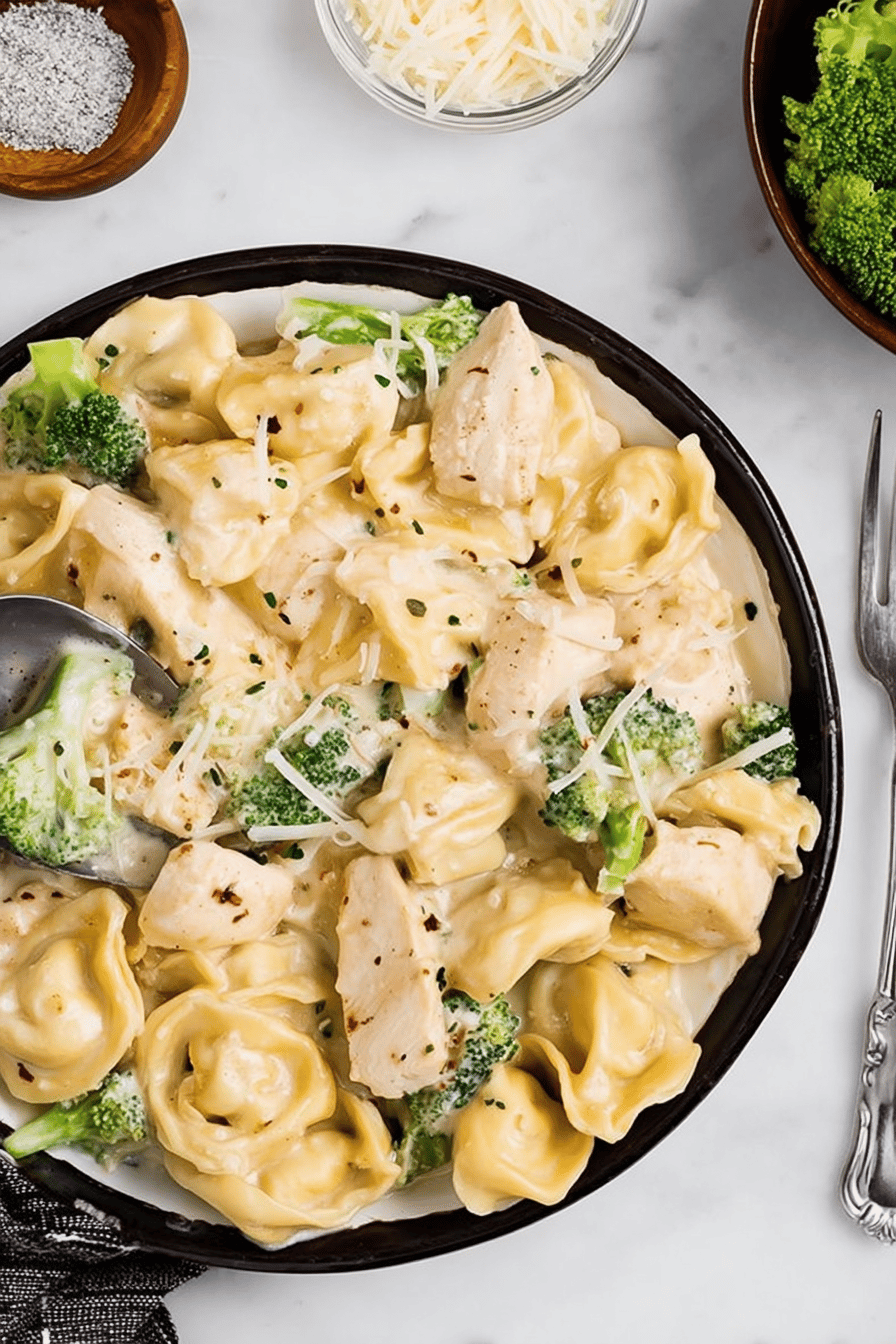 - 💡 Start pasta water boiling hard. Timing broccoli addition matters. Toss in broccoli when pasta with 2 minutes left. Keeps broccoli bright green but cooked. Watch water boil high to avoid mushy pasta. Drain separately, keep warm. Fresh tortellini cooks faster than frozen, taste test frequently. Frozen needs more time but hold broccoli back a bit. Texture counts here. Don’t skip rinsing pan after chicken, fond holds flavor; keep it.