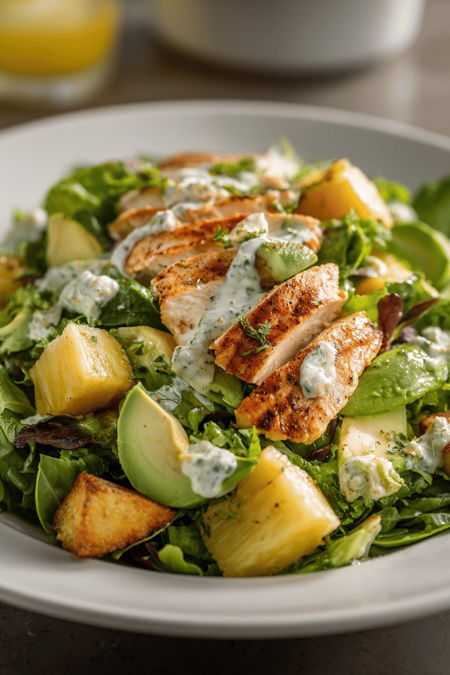 - 💡 Prep dressing first. Pulse mayo, Greek yogurt, pineapple, Dijon, lime juice, chipotle, salt, pepper. Watch texture; too pure means no fruit flecks left. Those bits matter. Chill to thicken ahead—not after salad dressed. Flavor melds better cold. If too runny, add more yogurt. Too thick? A splash lime. Dressing timing is everything. Keep in fridge until last second to stop soggy leaves.