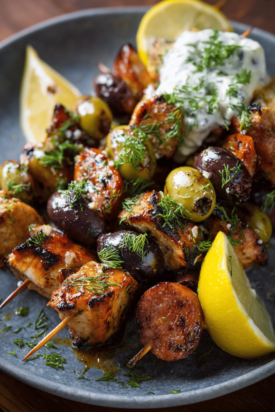 - 💡 Skewer handling tips: soak wooden skewers at least 30 minutes or burn risk and bitter smoke. Turn skewers with tongs, don’t stab meat repeatedly; juices escape through holes causing dryness. Alternate protein and fat slices to keep heat circulation balanced. Don’t overbunch olives or slices; too dense blocks heat, undercooks interior. Lemon wedges aren’t just garnish; squirt juice over hot meat after resting to brighten and cut fat. Serve creamy tzatziki or hummus on side for texture contrast and temperature balance.