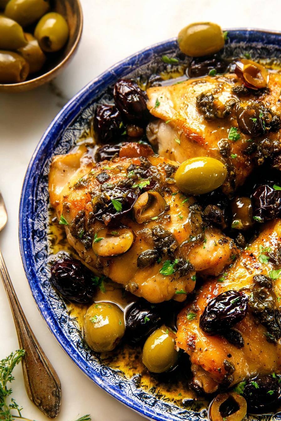- Use chicken legs if thighs unavailable. For olives, green Manzanilla or Castelvetrano work; swap black olives for punchier notes. Dried cherries can replace prunes for different sweetness—tart with chewy punch. White wine swap smooths acidity but if stuck with red, use a fruity lighter style. Don’t forget basting—you’ll mute dryness, keep skin crisp but tender underneath. Watch sugars on top don’t burn; if browning too fast cover loosely with foil for last 10 minutes.
