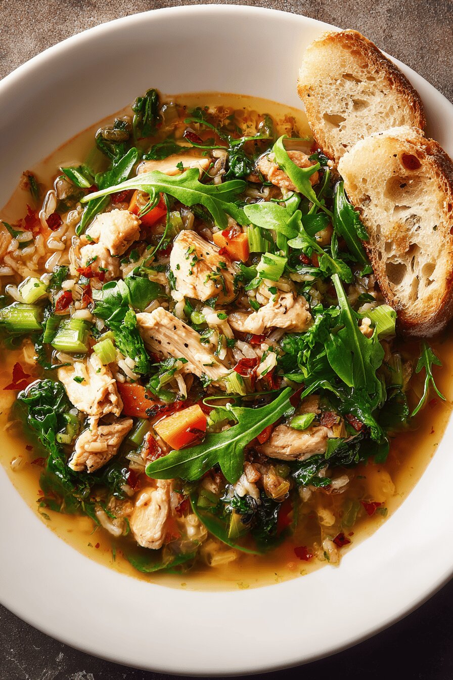 - 💡 Add chicken, arugula, Herbes salées near end—greens wilt too fast if early, lose peppery crunch, turn slimy. Stir gently once only to combine; over-stir ruins texture. Chicken chunks gently warm, no drying. Keep simmer low, rice starch thickens soup just right. Salt and cracked pepper adjusted last step, taste often.