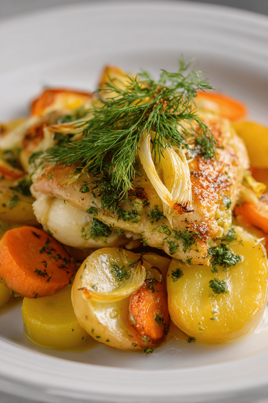 Zestier. Sharper cheese punch with manchego over pecorino. Tried courge poivrée before — dry. Zucchini lends moisture, slight sweetness. Cayenne green and firmer texture. Garlic presence here mild but noticeable. Mayonnaise isn’t just fat; it binds and browns chicken beautifully. Broiling seals browned crust; crucial for texture you don’t get roasting alone. Watch juices, not the clock. Oven heat differs, size of breasts varies — practice makes perfect. Potatoes should show rough brown spots, not limp. You’ll smell fennel spice blooming as it cooks. Don’t skip dill finish — brightens. The layering of citrus and fennel is key. Chicken skin optional but I skip it for quicker cook and cleaner mouthfeel.