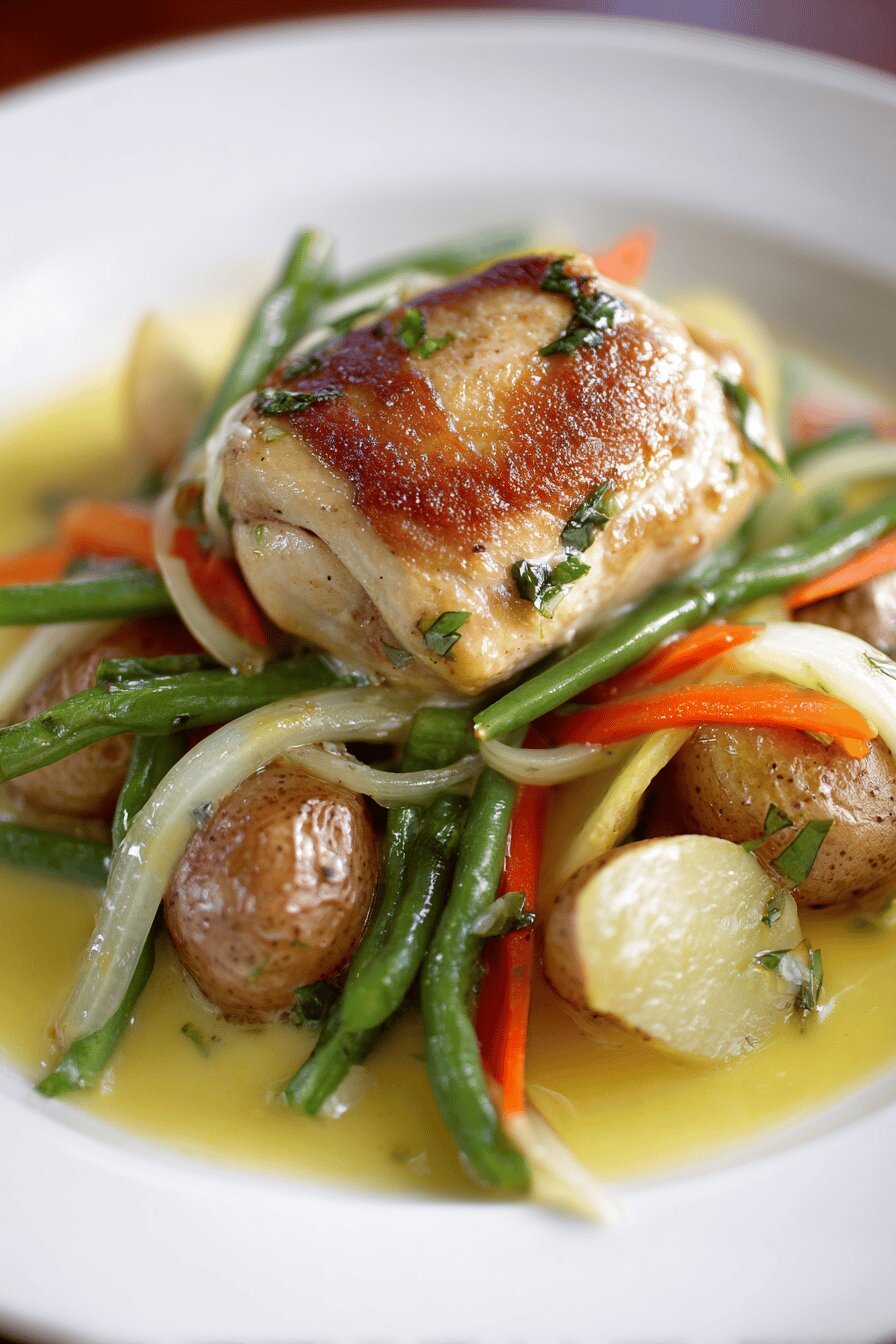 - Serve immediately. Texture should be tender chicken with a slight snap in vegetables, butter-wine sauce cutting through richness with a touch of acidity.
