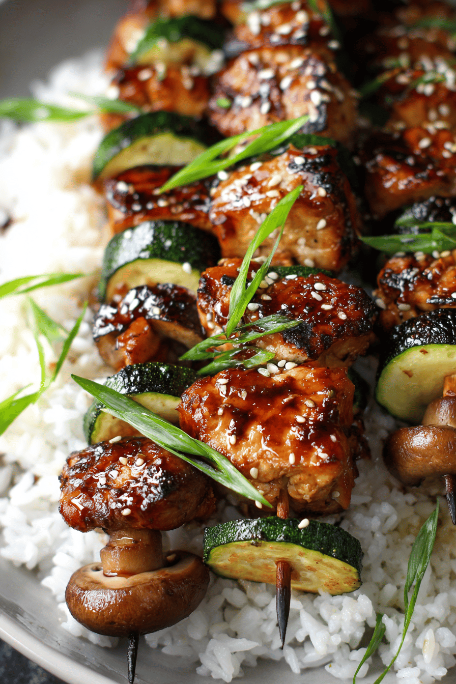 - Grill skewers 5 to 6 minutes each side. Chicken should reach 74°C (165°F). Caramelization on edges, veggies slightly softened.
