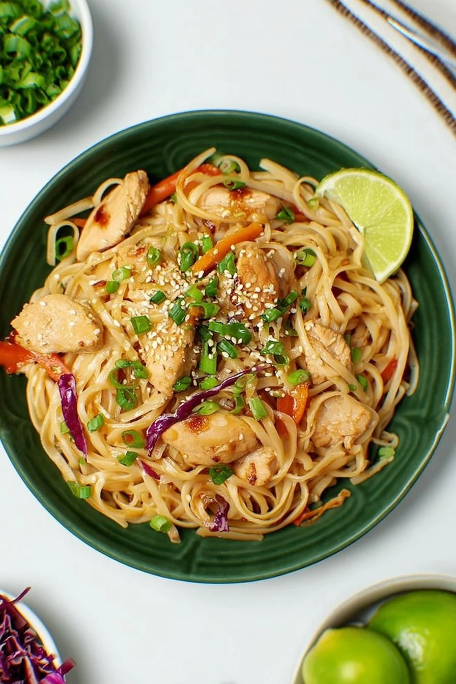 Fifteen ounces of stir fry rice noodles. The thin kind. Not pad thai noodles—those are chewier. The stir fry ones have that specific texture. A pound of chicken thighs. Boneless, skinless. Slice them yourself thin instead of buying pre-cut—better control, cheaper usually. Vegetable oil. Two teaspoons. Not olive, not butter. Vegetable oil gets hot enough without burning. Half a white onion, sliced thin. Yellow works too. Red onion changes the flavor in a way that doesn’t fit here. One clove garlic, minced. Just one. More garlic doesn’t make it better—tastes bitter if you overdo it. Light soy sauce, a half cup. Dark soy is too intense. The light kind blends. Two tablespoons toasted sesame oil. This is what makes it taste right. Regular sesame oil tastes raw. A tablespoon of honey. Sugar works. Honey’s smoother. Fresh lime juice. A tablespoon. Bottled lime is sad. Worth squeezing one lime. Half a teaspoon ground ginger. Powder. Fresh ginger is better but also more work—powder is fine here. Half a teaspoon crushed red pepper flakes. Or less if you hate heat. Twelve ounces shredded cabbage mix. That coleslaw mix from the produce section. Broccoli coleslaw works the same way. A teaspoon of toasted sesame seeds. They have a different flavor once toasted. The raw kind tastes like cardboard. A quarter cup of scallions sliced thin. Green onions. Whatever they call them where you are.