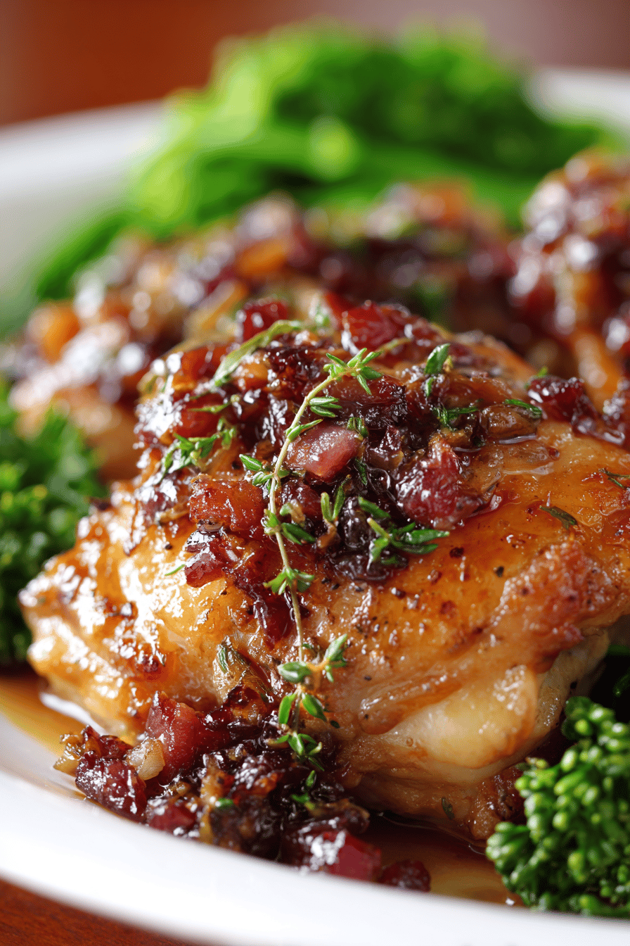 Start with pancetta browning in limited oil to render fat and crisp. Add onions, long slow cooking to caramelize without burning. Season early so onions absorb flavors. Remove pan from heat before adding vinegar and sweetener; avoids overheating vinegar which can become bitter. Jam reserved separately to avoid burning during chicken cooking. Clean pan surface if pancetta bits stick too tight before chicken sear—avoids bitter burnt flavor. Seared chicken thighs 4 minutes per side keep juicy, avoid drying. Salt pepper chicken after first flip to season within. Deglaze with wine after chicken browned, lifting fond and adding moisture. Simmer wine 3-4 minutes reduces alcohol, concentrates flavor. Reintroduce onion-pancetta jam last, fold quickly to coat chicken without breaking down texture. Warm all together 3 minutes maximum to meld. Serve immediately, sauce best when warm and glossy. Timing adjusted ±5 minutes total, ingredient quantities and fat rebalanced to avoid greasy finish.