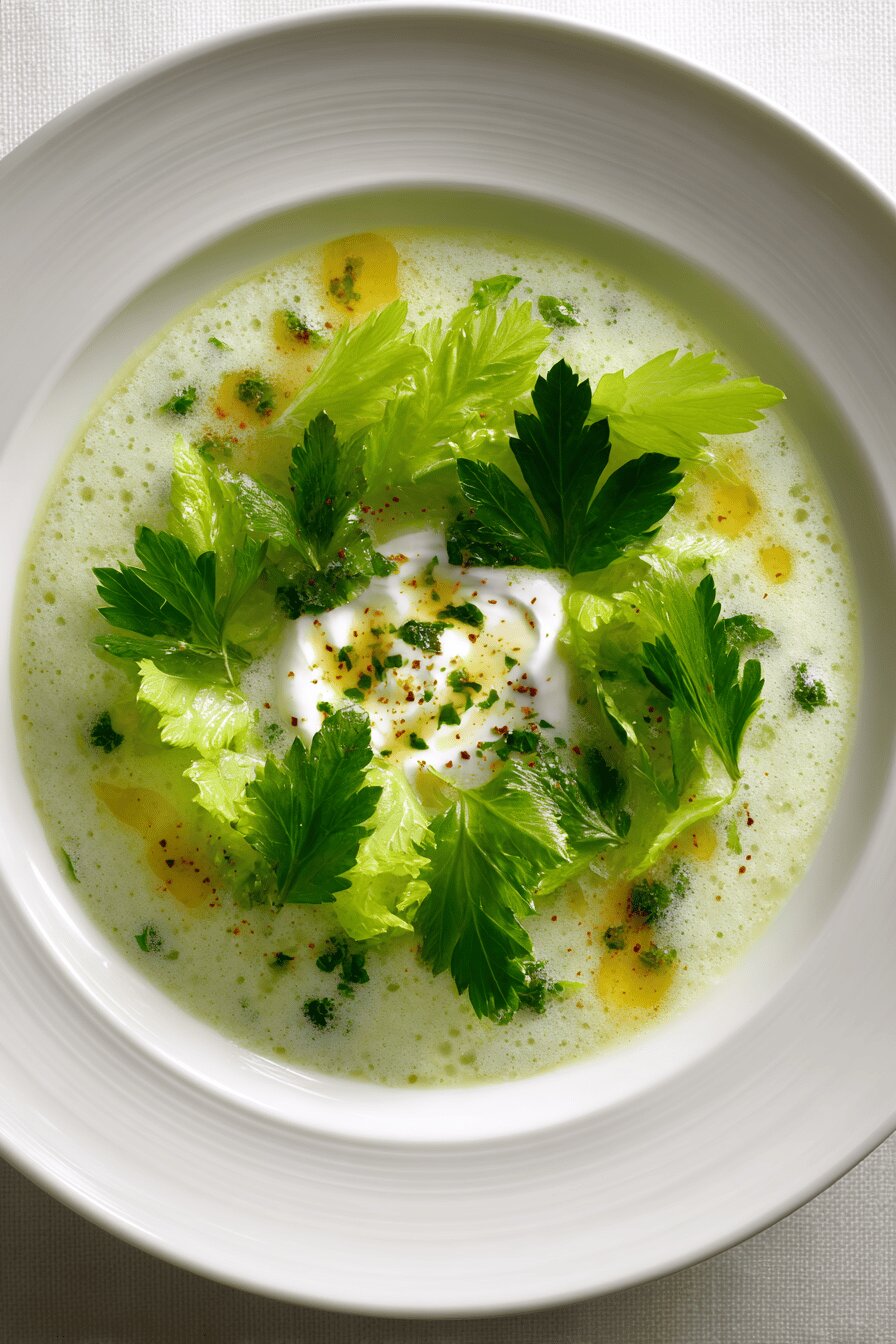 - 💡 Ice cube in serving bowl melts slow. Controls dilution gently adds meltwater chill in mouth. Add crème fraîche on top not stirred in. Temperature contrast hits differently on palate. Garnish last minute celery leaves fresh, crisp, slight bitterness contrast with creamy dollop. Celery seeds optional sparing crunch not overpower.