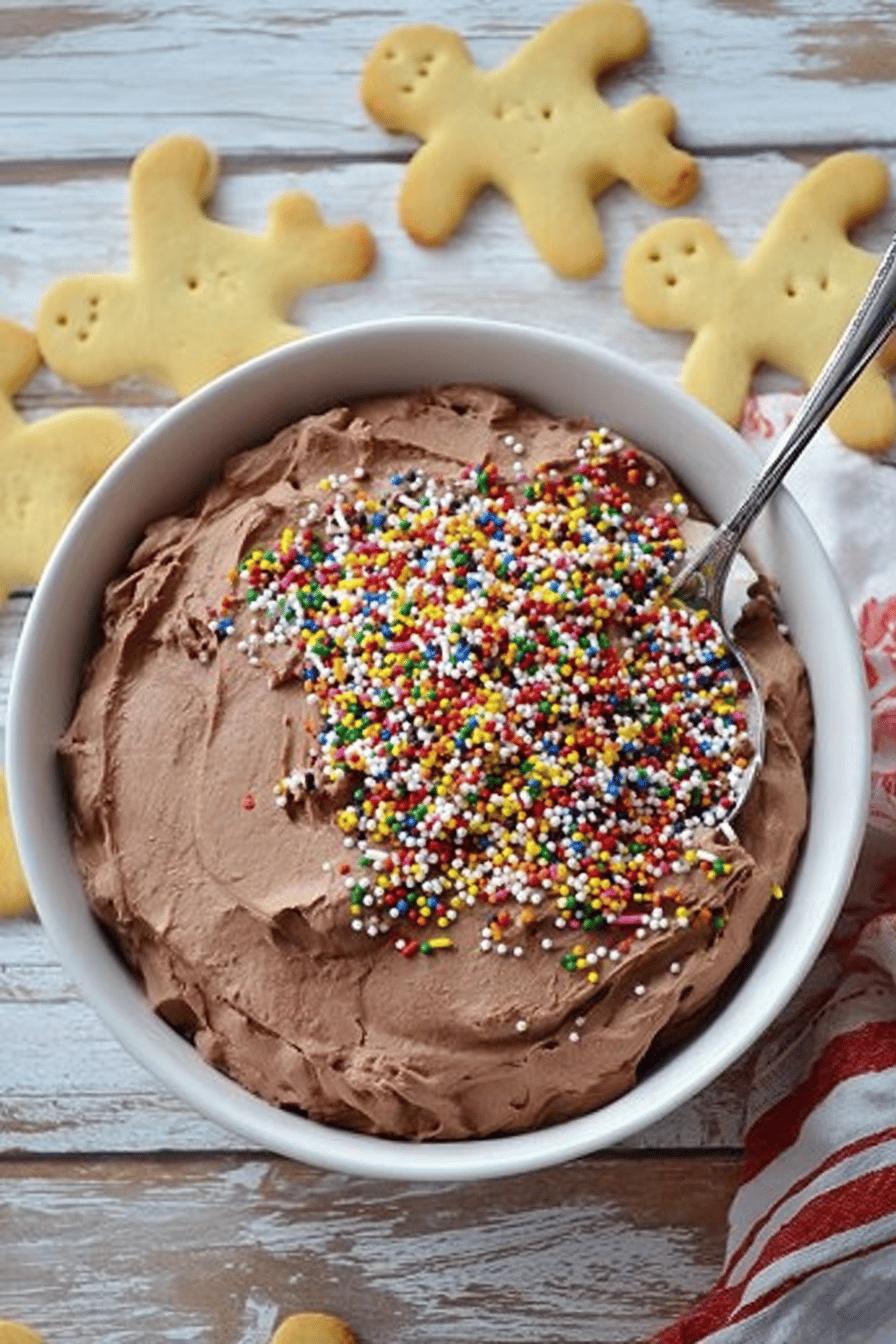 Refrigerate airtight container. Dip firms as it chills, stir before serving again. Left out too long sprinkles soften, dip may get watery on surface. Let rest a bit at room temp before scooping. Up to few days, but texture shifts fast after 3+ days.