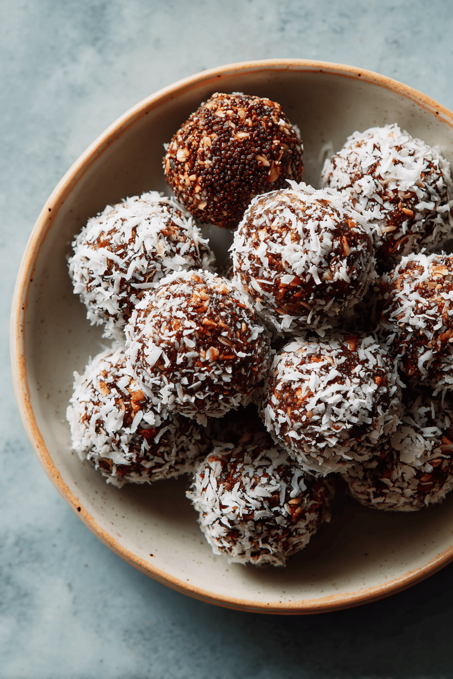 - finely shredded toasted coconut or cocoa nibs for rolling