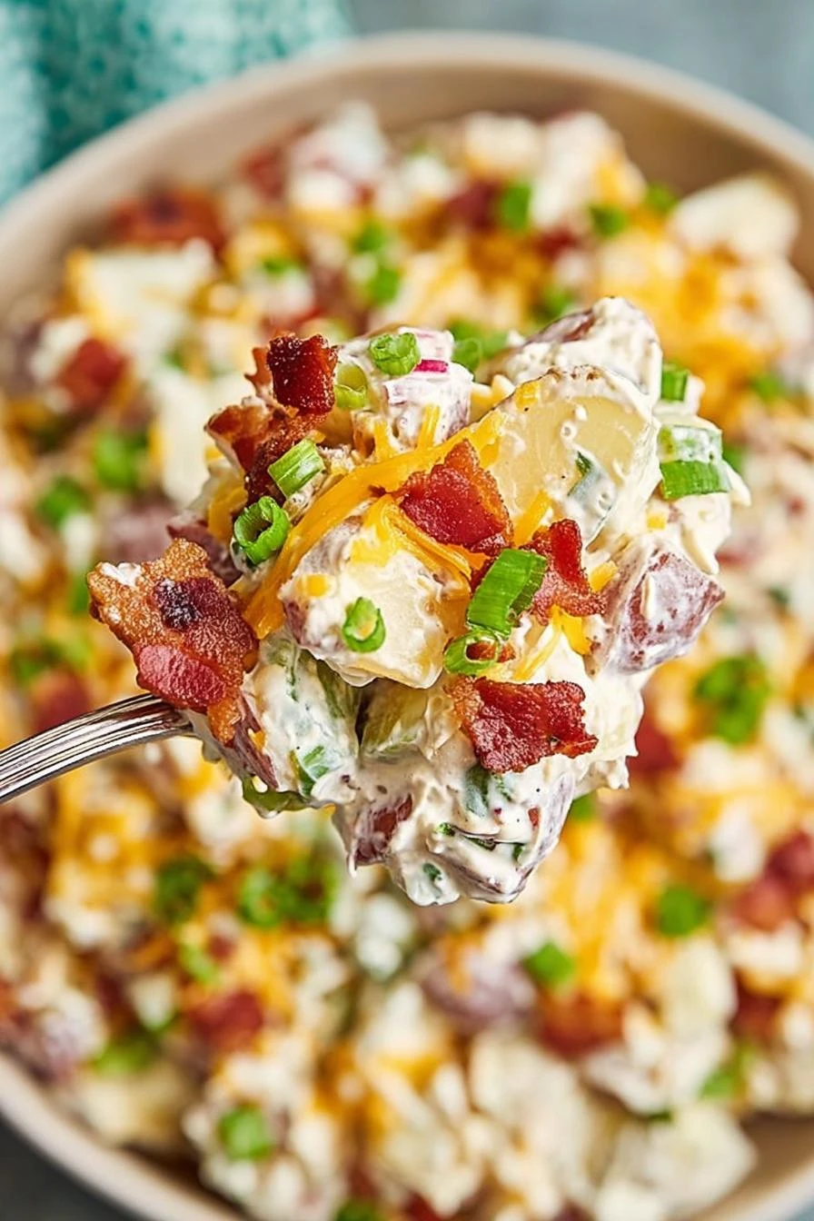 Can I make loaded potato salad ahead of time? Yeah. Day before is fine. Cover it tight so it doesn’t dry out. Onions soften but the potatoes stay their texture. Tastes better the next day usually.