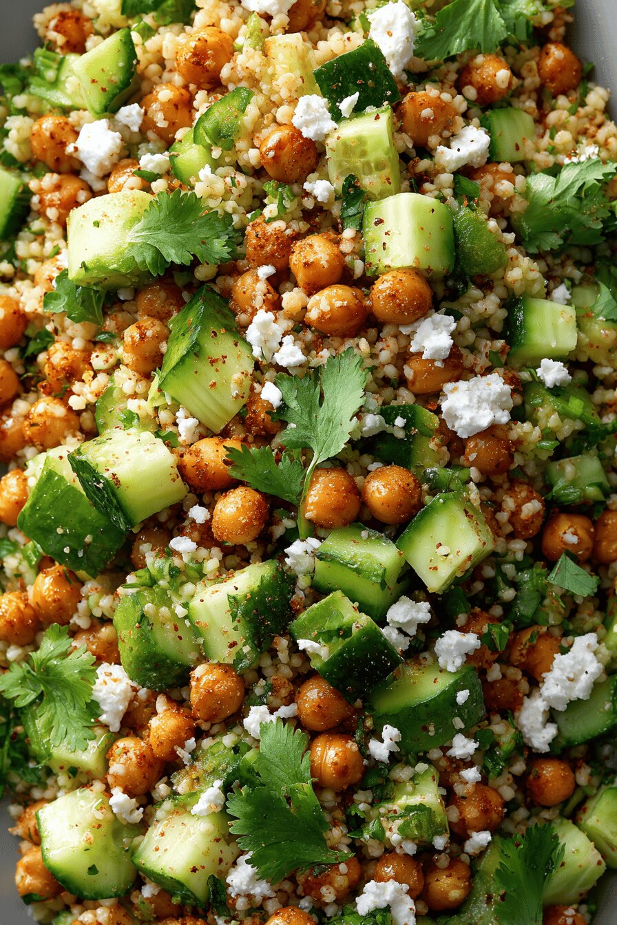 - 💡 Chickpeas rinsed well to cut canned tin flavor and excess sodium. Mix veggies and goat cheese before tossing couscous. Big pieces stay intact, texture contrast sharper. Salt after combined—broth and cheese already salty variable, taste first then adjust. Try halloumi for firmer, salty bite, but warm toss only; cold it stiffens and crumbles less.