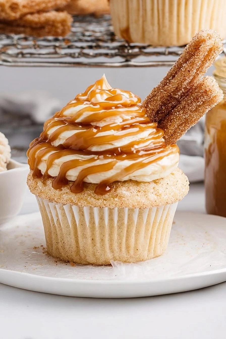 - 8 Transfer frosting to piping bag fitted with large star or round tip. Pipe generous swirls atop cooled cupcakes. Drizzle caramel in zigzags over frosting then top with churro pieces or crunchy cinnamon cookie shards.
