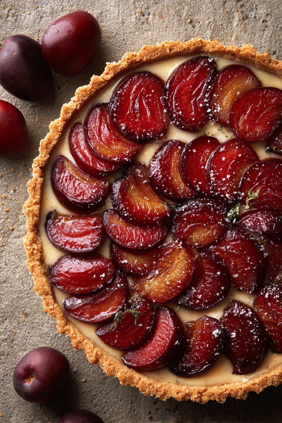 - 13. Scatter plum slices randomly but tightly covering cream. No precise pattern needed—this rustic look lets fruit shine, juice stains add character.