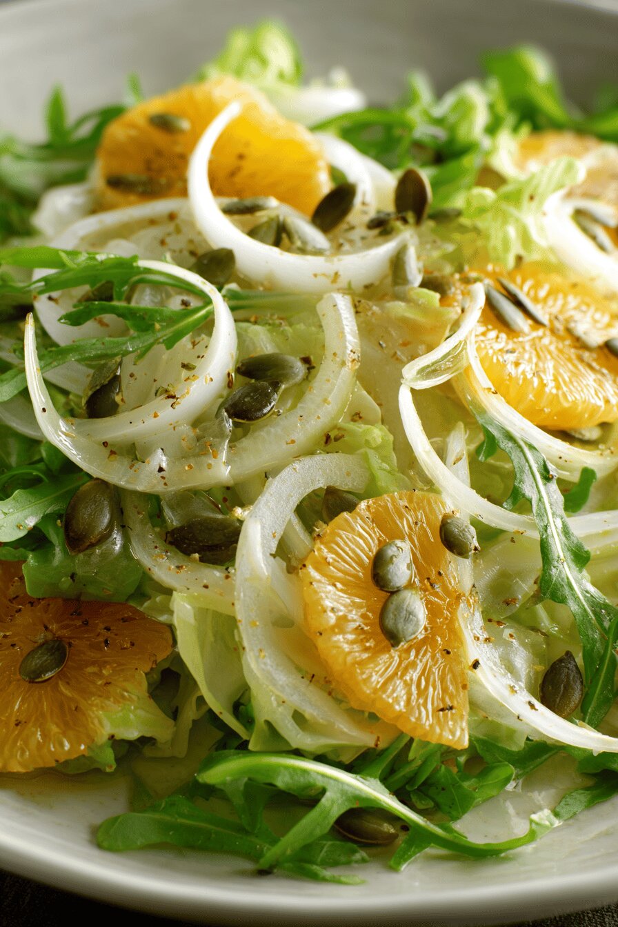 Lemon juice replaces white wine vinegar to brighten and bring citric zest. Honey instead of sugar for natural sweetness, blends smoother. Toasting pumpkin seeds unlocks oils, enhances crunch and adds depth, replacing fenouil seeds for variation in texture and aroma. Fenouil sliced paper-thin to stay crisp and let dressing soak in. Mixed greens combine the pepperiness of arugula and mild mesclun, balancing sharp fennel. Olive oil extra virgin, cold pressed for fruity body. Salt and fresh cracked pepper used sparingly to allow space for each ingredient’s character. Use fresh fennel bulb avoiding wilted or browned parts. Greens best fresh. Toast seeds just before use to keep crunch at peak. Dressing can be made ahead, fennel tossed early to absorb flavors, greens kept separate to prevent sogginess.