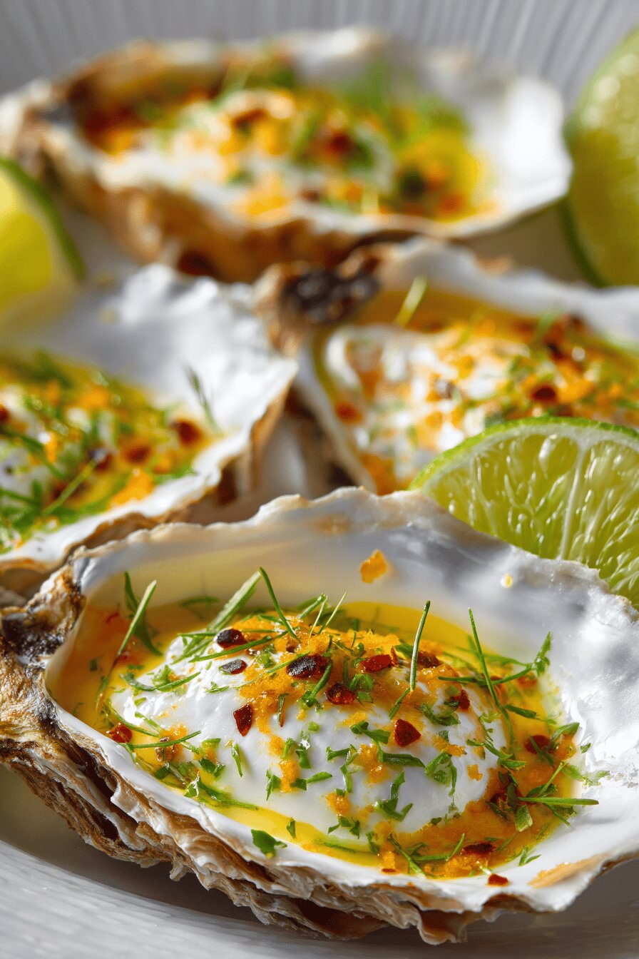 Egg yolks are the base for the citrus butter sauce, giving richness and body. Zesting both an orange and a lime adds brightness and a tang with a twist instead of the classic lemon. Butter is best unsalted for control over seasoning, cut in cubes to melt slowly for smooth emulsification with the eggs. The oysters should be fresh and shucked, no shells needed but shells help if you wish to present traditionally. Whipped cream adds a soft texture contrast, folded in gently to keep air light. Chili flakes are a subtle heat surprise. Salt and pepper essential for balance but keep it light so citrus shines. Keep cream unsweetened to maintain savory balance. Careful with temperature during sauce prep, it can curdle if too hot. Patience makes silky. Small gratin ramekins can be replaced with shell halves on coarse salt to keep steady under broiler.