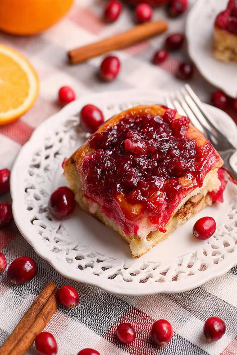 - Roll dough tightly starting from narrow edge into long log. Use sharp serrated knife. Cut into 12 equal slices about 1 3/4 inch thick. Arrange slices cut side down, close on cranberry layer in pan.