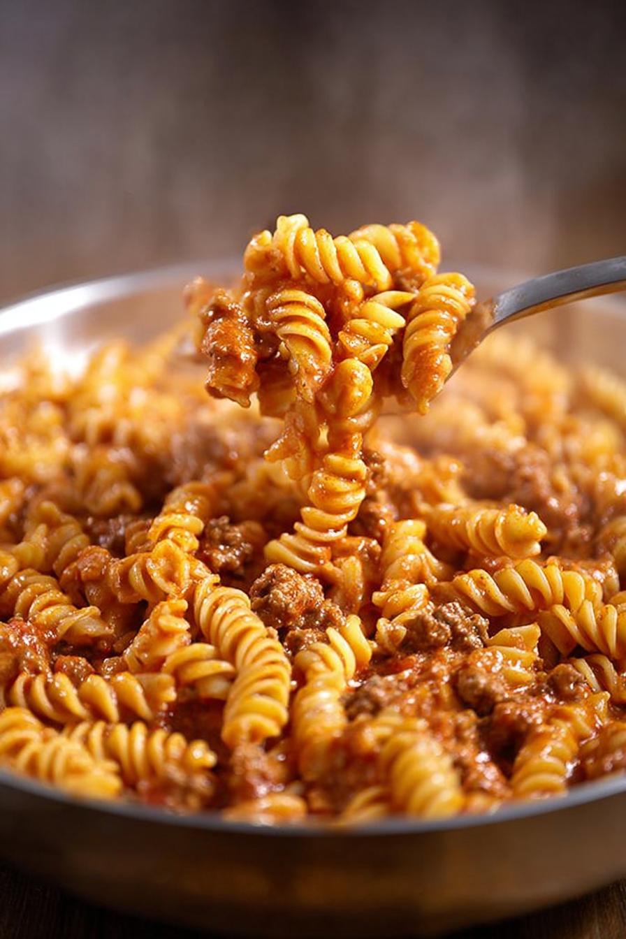 Ground beef simmered with garlic and Italian spices, finished creamy with cheese and tossed with pasta. Comfort in one skillet. Rich, thick sauce clings to every strand.