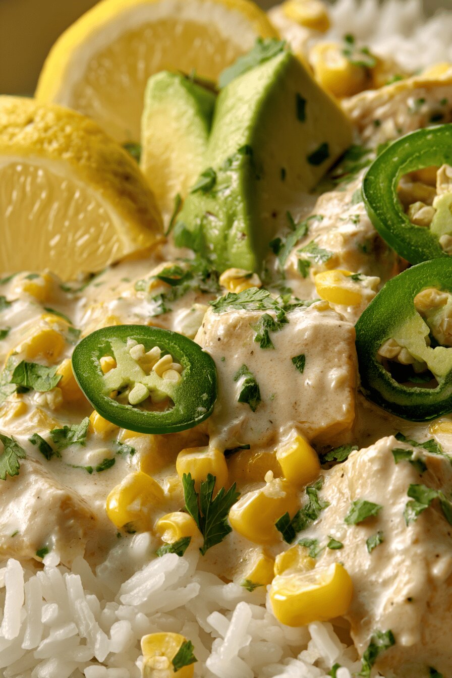 Grilled poblano peppers roasted to tender, peeled, and sliced. Sweet corn kernels sautéed with sliced red onion. Chicken breasts halved, pan-seared until golden. Sauce blended with cream, chicken stock, fresh cilantro, and poblano strips. Simmered until thickened. Final assembly with sliced avocado, lime wedges, optional jalapeño rings. Served hot, optionally with rice. Modified quantities and ingredient swaps like sour cream for cream and lemon for lime for a citrusy edge. Cooking times tweaked slightly for texture and flavor depth.