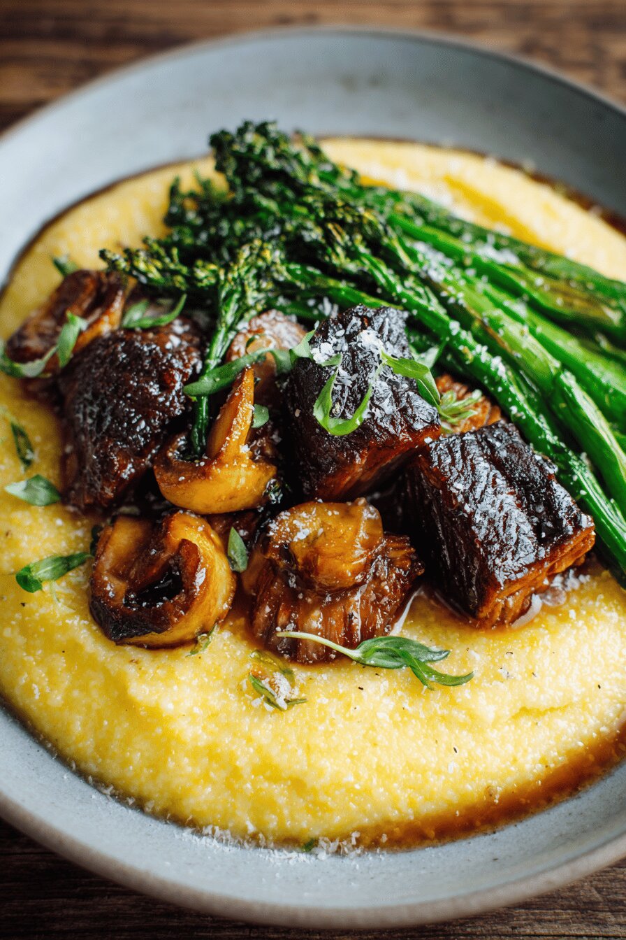 - Serve immediately—polenta firms quickly as it cools. For leftovers, reheat gently with splash of broth or water.