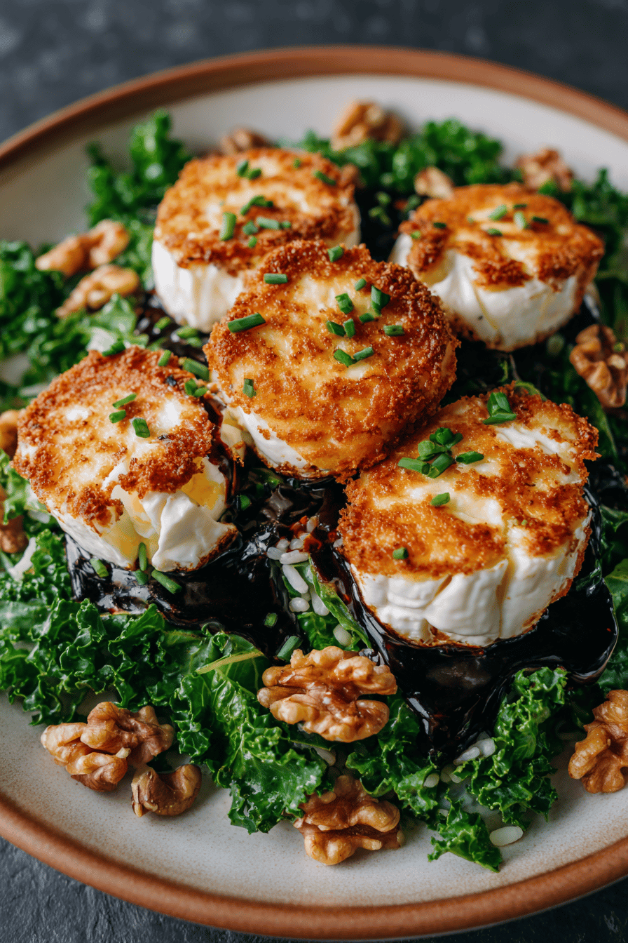 - 9. Portion kale salad on plates, top with crispy goat cheese rounds, sprinkle crushed walnuts. Finish with drizzle of honey over everything for contrast.