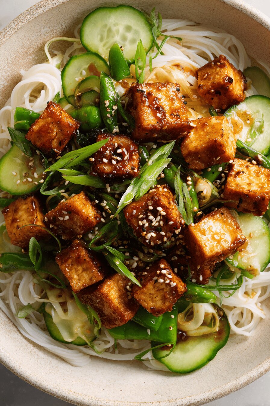 - 💡 Assemble bowls last minute. Noodles cold, tofu still warm, veggies juicy but crisp. Toss tofu carefully with dressing to keep crust intact; clumsy folding breaks cubes, sauce seeps in weakening crunch. Toast sesame seeds dry pan few minutes — smell nutty, watch close. Scallions sliced thin for bite, contrast texture and flavor. Timing’s everything to keep bowl lively, never soggy.