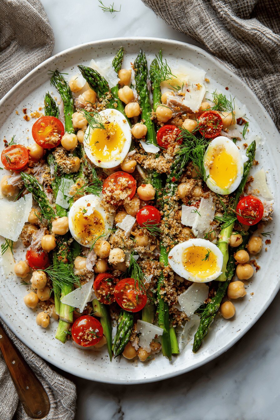 - Halve eggs lengthwise on cutting board, keep ready. Place asparagus in big bowl. Add chickpeas, tomatoes, 1/4 cup olive oil, vinegar, and grated Grana Padano. Season with salt and freshly ground black pepper. Toss gently but fully combine dressing, bright acidity cuts through richness.