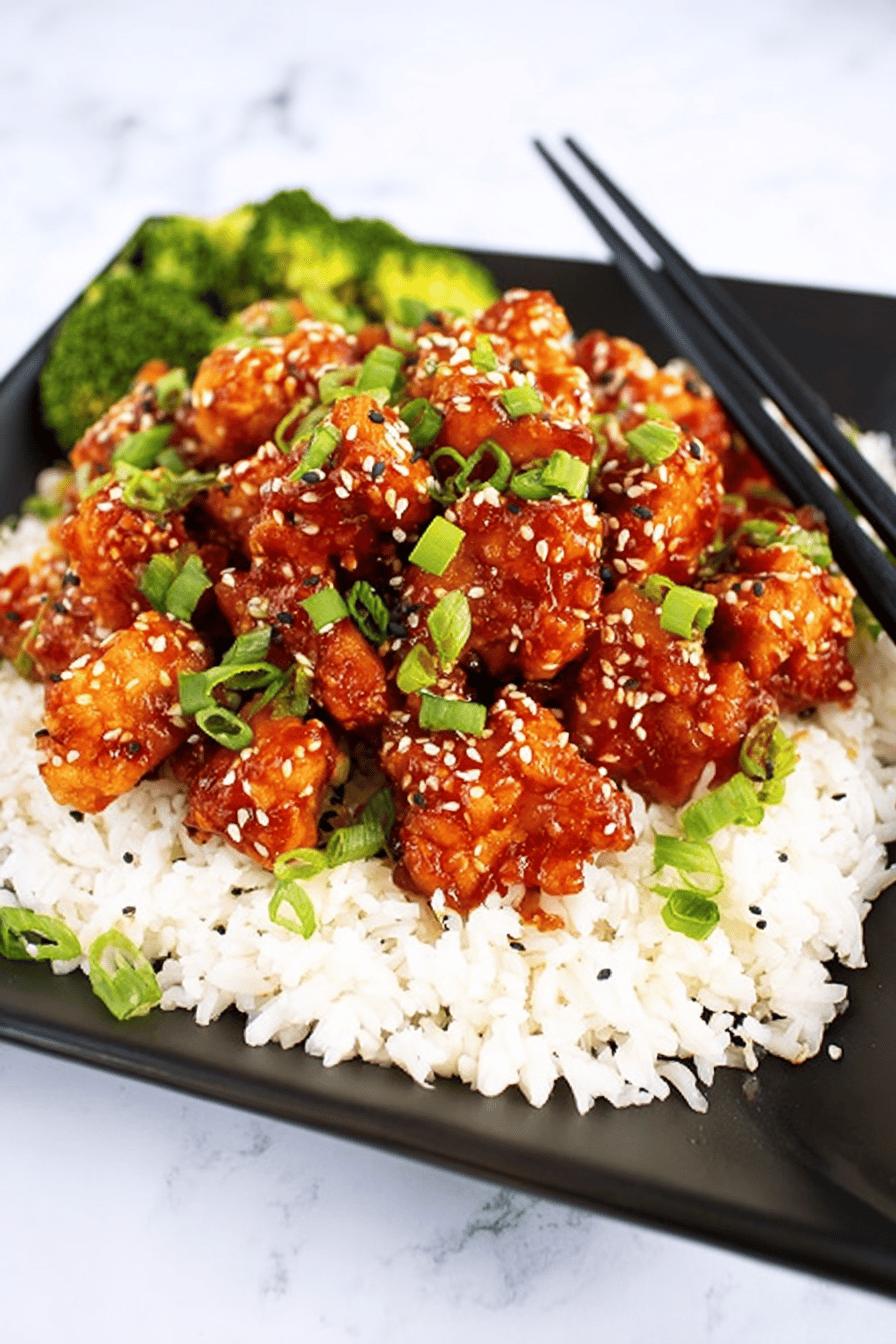 - Plate chicken, sprinkle toasted sesame seeds and sliced green onions over top. Serve over hot steamed rice or alone for snack mode. Extra sauce? Use as dipping or drizzle over veg.
