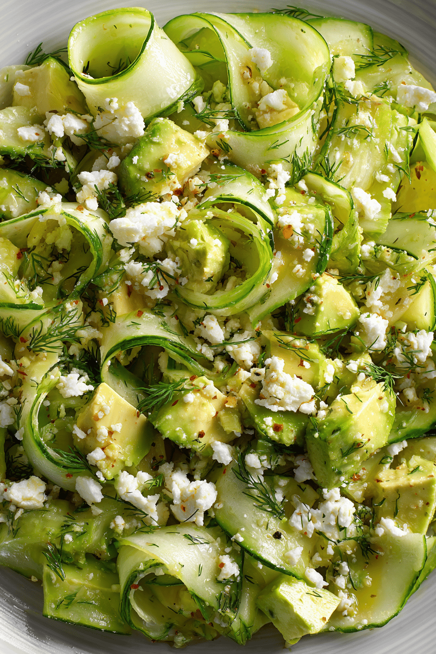 A light, textured salad with crunchy cucumber ribbons and creamy avocado, quickly tossed with fragrant herbs and tangy dressing. Uses thin cucumber slices from a mandoline, diced ripe avocado, crumbled feta cheese, and fresh dill, finished with lemon juice, olive oil, and a touch of heat from hot sauce. Simple, fast, refreshing, with hints of oregano for deeper aroma. Perfect for quick meals when freshness and layering flavors matter. Adaptable with other herbs and proteins.