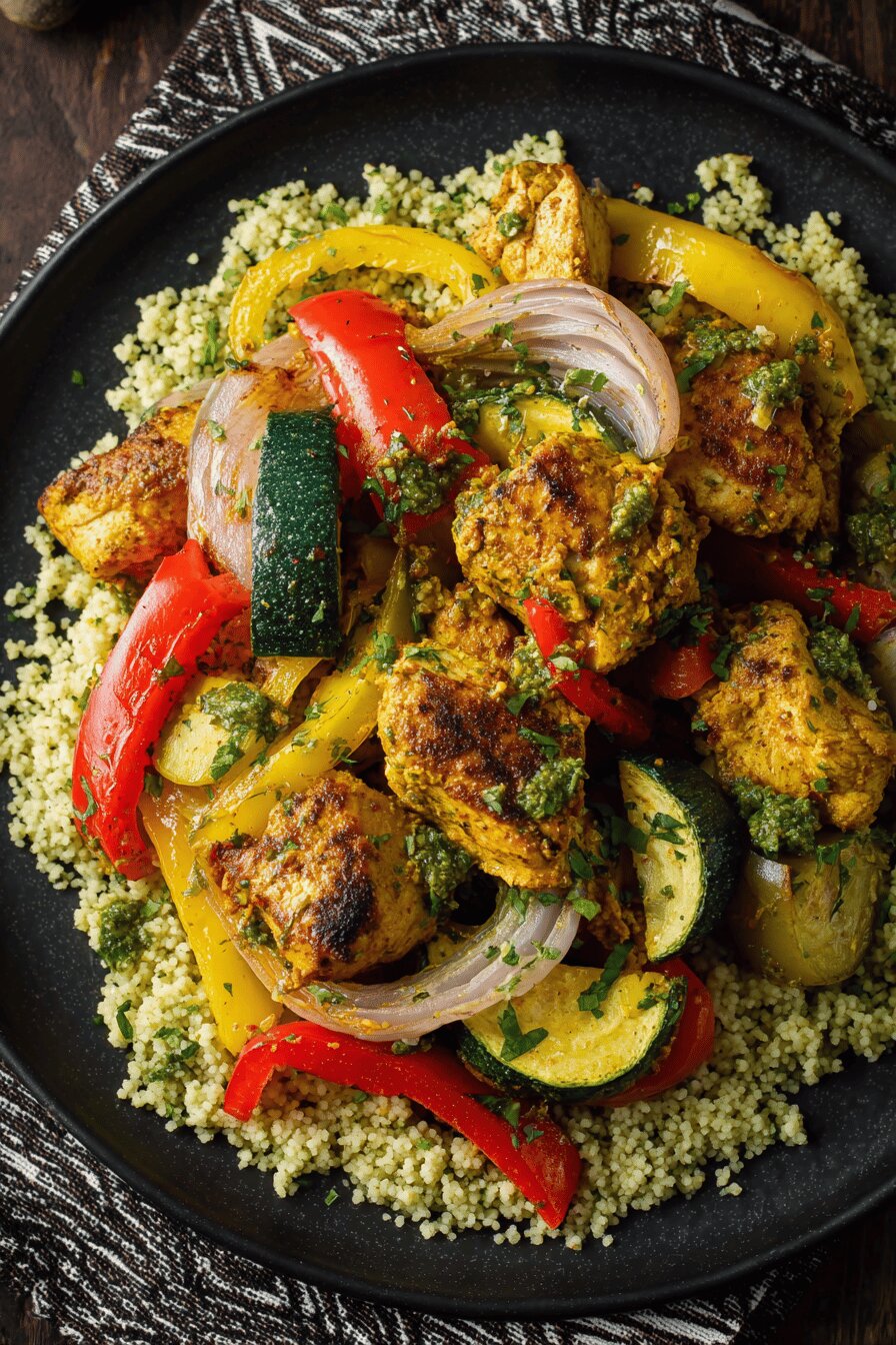 - Plate couscous, scatter chicken pieces and roasted vegetables on top or alongside.