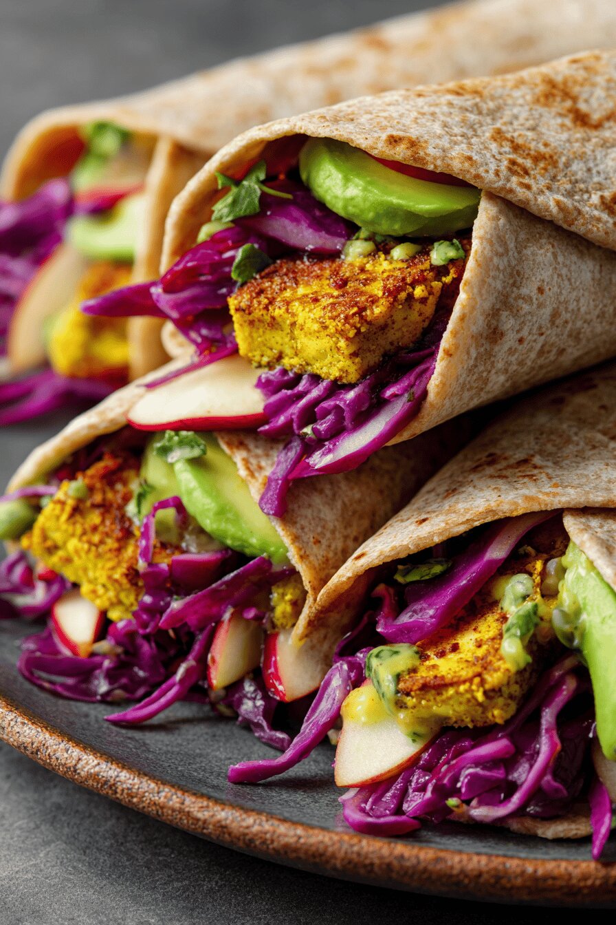 Wraps don’t keep well long term; best eaten soon. Refrigerate in airtight. Add avocado fresh after reheating wrap to avoid browning. Can freeze tofu separately but slaw and avocado lose texture. Practical approach—make slaw ahead, assemble right before eating.