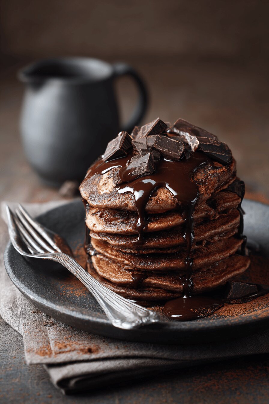Fluffy double chocolate pancakes with folded egg whites and chunks of dark chocolate. Uses buttermilk and a mix of cocoa and unbleached flour. Leavened with baking powder and baking soda. Folded batter rests briefly for better rise. Cooked in butter till golden, flipping once bubbles form. Serve with chocolate sauce or syrup. Substitutions for milk and butter included. Timing cues based on color and bubbles, not just minutes. Egg white folding technique keeps pancakes light. Chocolate chunks add texture and bursts of cocoa. Slight adjustments in sugar and resting time improve texture from previous attempts.