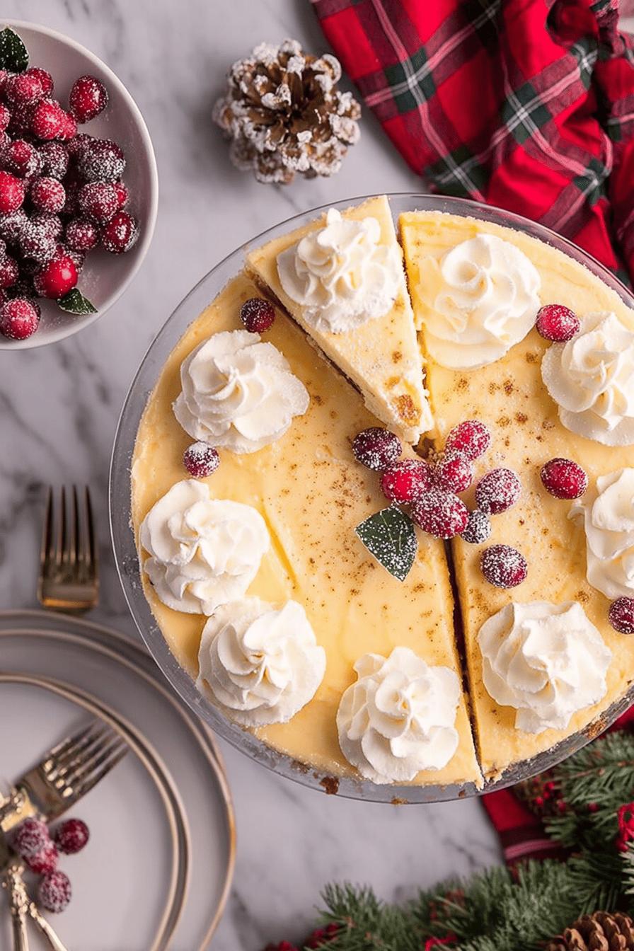 - If crust soggy, bake longer unfilled and press tighter. If cracking appears despite water bath, check oven temp with external thermometer — usually too hot is culprit. Eggnog brand varies in sweetness; adjust sugar accordingly or reduce eggnog slightly if watery consistency. Rum extract can be swapped with bourbon or omitted for milder flavor. Use room temp ingredients or cheesecake texture suffers. Avoid overmixing eggs to prevent air bubbles and cracking. If no stand mixer, hand beating cream cheese first till super soft helps a lot. Water bath water must be hot but not boiling to keep cake moist and crack-free.