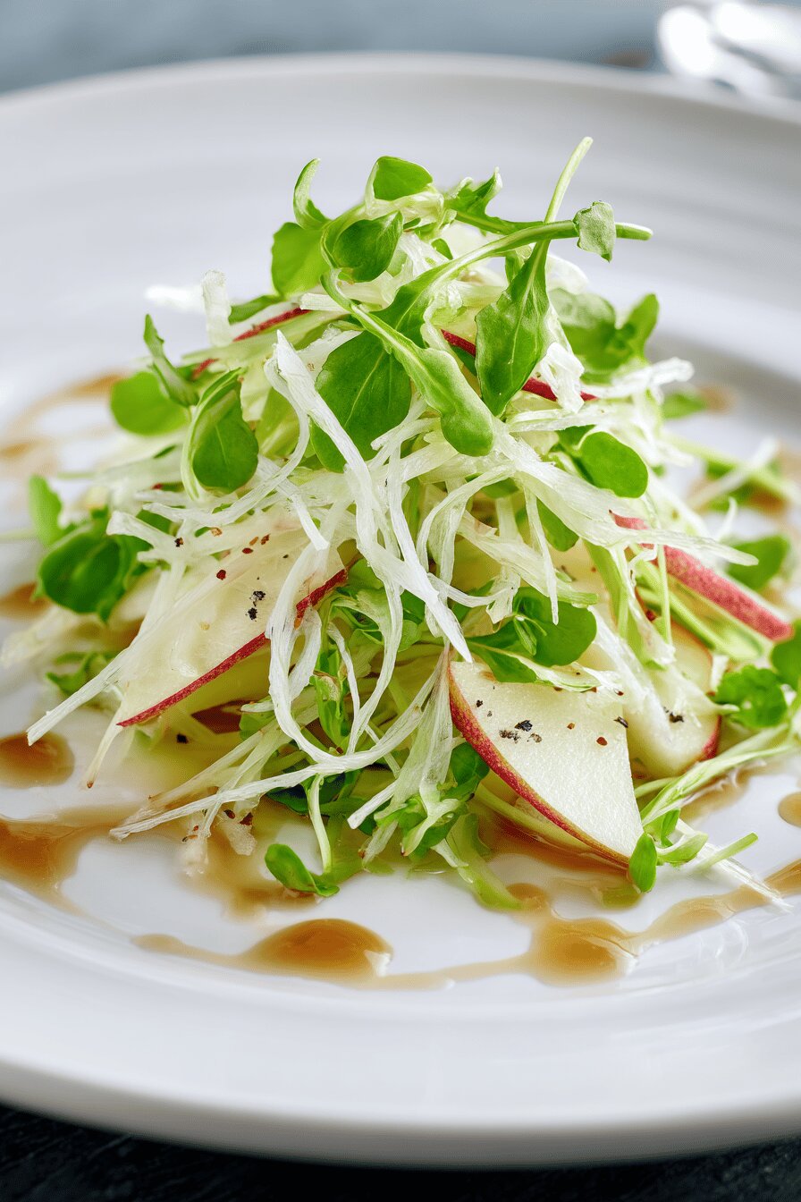 - 💡 Knife skills central; uneven cuts wreck mouthfeel. Mandoline best for celery root and apple. If no mandoline, use peeled vegetable peeler blade for thin shavings. Micro arugula delicate—fold carefully, no crushing. Toss fast to coat dressing but keep slices distinct. Salad goes well with beans or grains for bite and fullness without heaviness. Timing and texture dominate, not just ingredients.