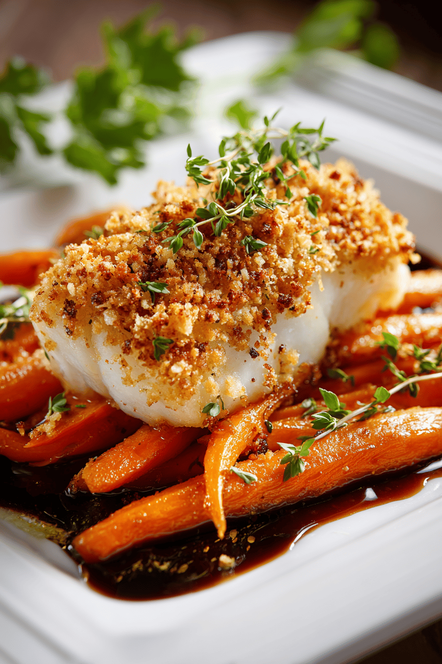 Carrots thick cut to retain texture when glazed; avoid too thin slices—they’ll mush after cooking. Avocado oil chosen for higher smoke point; can substitute with grapeseed oil or sunflower oil for neutral flavor. Maple syrup thicker and less floral than honey; but honey works if that’s all on hand. Balsamic vinegar provides sweetness and tang; alternatives like aged red wine vinegar or sherry vinegar can shift flavor profile nicely. Shallots essential over onions—milder, sweeter; swap with leeks in pinch but adjust cooking time. Bread slices: day-old rustic white or sourdough preferred for sturdier crumb; no sandwich bread, too soft, soggy crust. Digestive biscuits add subtle sweetness and crumbly crunch; abandoned Graham crackers as hard to find in many places, digestive biscuits more versatile. Allspice replaces pimento, gives warm, peppery layers without heat; cinnamon or nutmeg acceptable substitutes but less sharp. Garlic measured finely; too coarse ruins texture. Fish fillet thick and even in size; cod and haddock great, pollock or halibut work — skin off prevents soggy bottom and bitter burnt edges. Consider removing bones meticulously, no surprises mid-bite. Salt and pepper crucial; season throughout to avoid dull plate. Rest crust mixture in fridge briefly for deeper flavors if time allows.