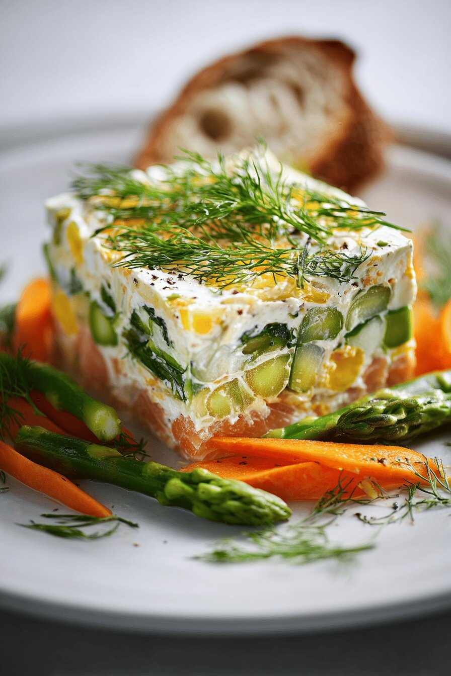 - 6. Spread half the fish mixture evenly in the mold. Layer the asparagus and carrot sticks alternately on top in neat rows. Don’t crowd, just one layer.