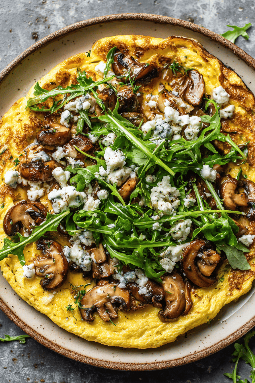 - When omelette is puffed and firm, remove carefully — use a silicone spatula or just tilt pan allowing air to circulate and lift edges without puncturing. Scatter mushrooms over entire surface, crumble ricotta salata on top, then pile salad gently on one half or serve on the side. Eat immediately before the souffle deflates.