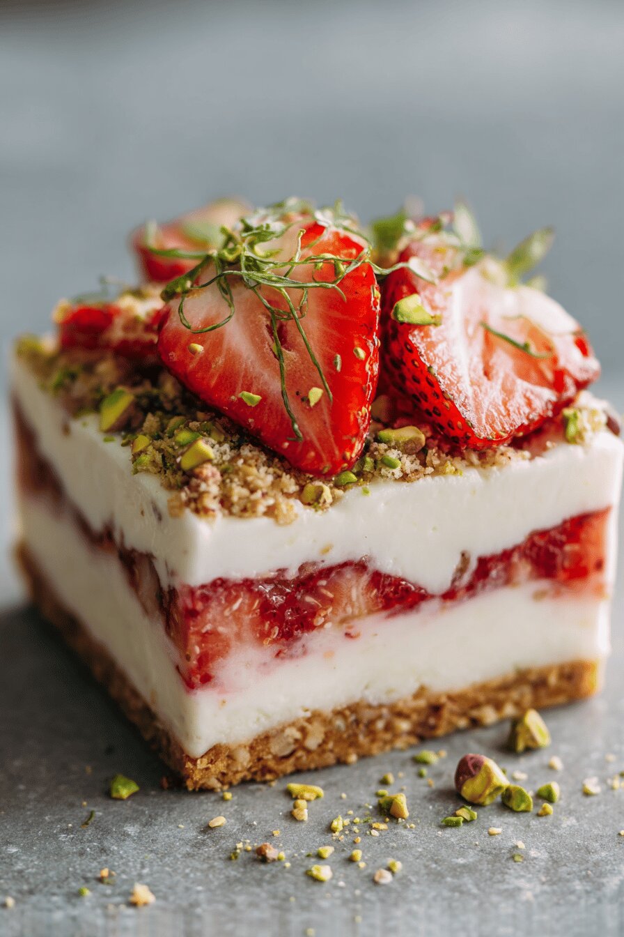 Using spelt flour instead of wheat changes texture slightly, providing nuttier flavor and hearty crumb. Coconut sugar substitutes white sugar, offering molasses notes and richer brown color while keeping sweetness moderate. Including crushed pistachios in crumble adds unexpected crunch and color contrast, enhancing mouthfeel. Quick oats ensure crispy crumble but avoid harsh chewiness. Sweetened shredded coconut keeps flakes moist and toasty when baked. Unsalted butter softened allows binding without greasiness. Frozen yogurt softened just enough to spread in thick layers—avoid melting into crumble. Strawberries marinate with fresh lime juice and vanilla seeds, harvesting aroma and tartness into fruit juices creating natural syrup. All ingredients must be fresh especially dairy and fruit.
