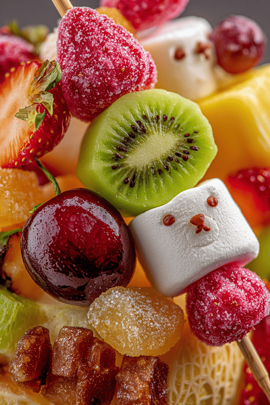 - π‘ Prep clean. Dry ingredients for better sticking. Avoid mushy fruit. Ripe pineapple is firm. Kiwi halves should be peeled neatly. Mix candy types. Gummy bears are fun, but other jellies work too. Alternate textures for snacking pleasure. Large marshmallows counter chewy jujubes. Kids love vibrant colors.