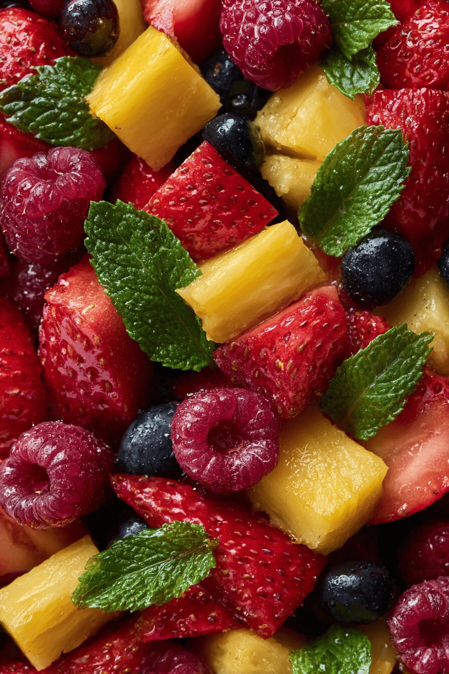Strawberries and raspberries chosen for tartness and texture. Pineapple adds juicy sweetness with tropical citrus hints, mimicking mango’s role but lighter. Fresh better but canned okay drained well. Maple syrup replaces simple syrup for richer complexity and antioxidants, pairs better with lime. Lime juice crucial to balance sweetness, avoids flat blandness, adds refreshing note. Mint leaves chopped fine to release oils without overpowering fruit. Use fresh herbs to avoid bitterness. Quantities adjusted slightly to maintain overall volume and taste balance. Can tweak syrup amount to taste or fruit ripeness. Keep all fruits vibrant, avoid overly soft pieces to reduce mushiness after chilling.
