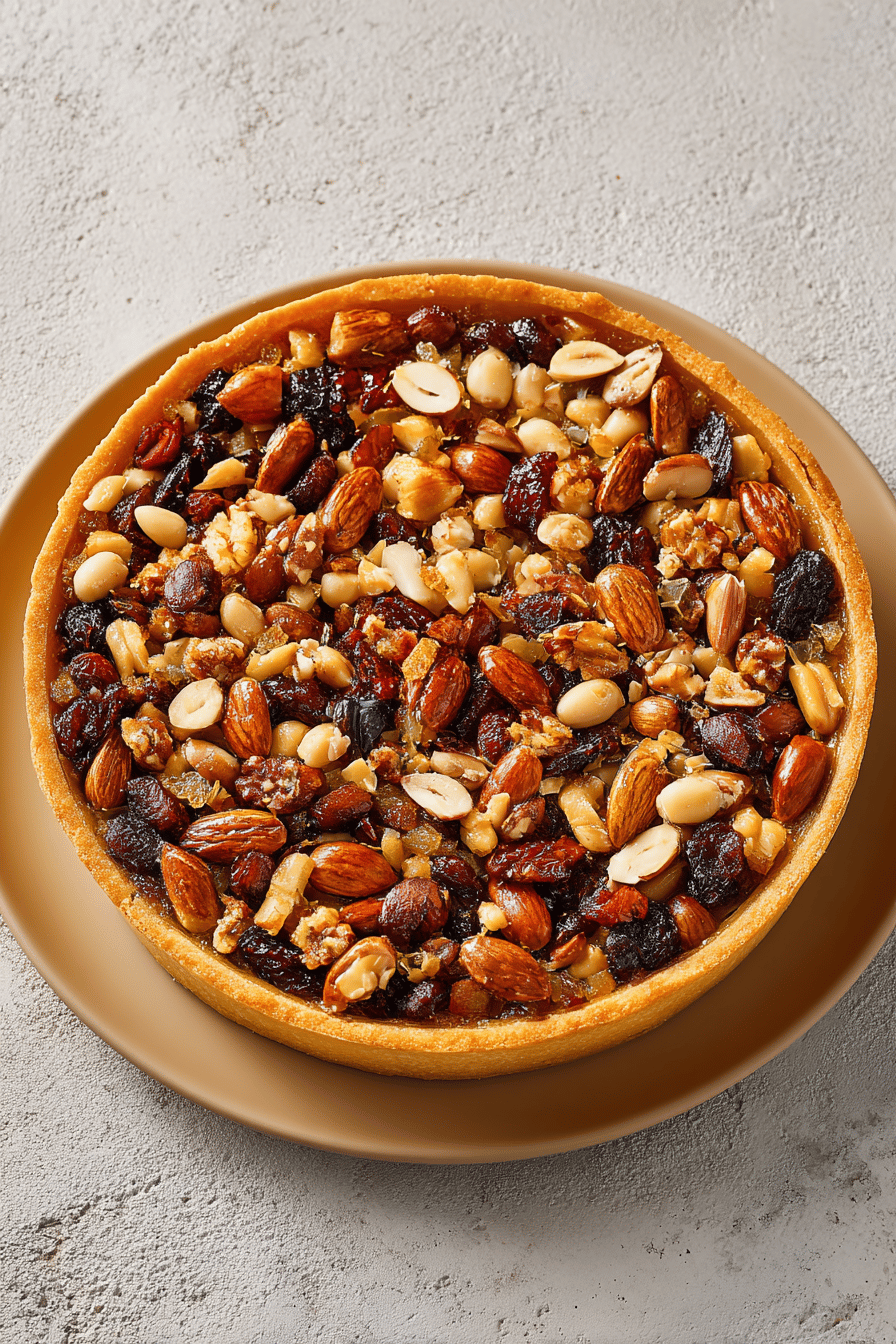 A tart packed with toasted mixed nuts and dried fruits, bound with almond paste now swapped for marzipan for added depth. Adjusted nuts quantity slightly, replaced rum with brandy for a different kick. Prebake crust longer for a crisper base. Cook times tweaked, steps shuffled for methodical layering. Emphasis on tactile cues like crust firmness and golden edges, plus aroma clues when nuts toast right. Practical notes on nut substitutes and saving a too-wet fruit mix. Bright orange zest lifts, subtle brandy warmth. Dairy cream inclusion keeps filling rich and stable despite longer bake. A dessert relying on sensory reads beyond clocks. Always room for personal twist or use leftover nuts/fruits.