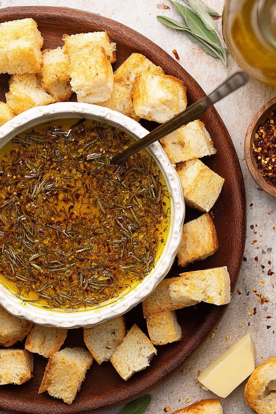 Start with dry ingredients so nothing clumps. Mixing oils and vinegar forms temporary emulsion; stir too hard and it breaks so do it gently but fast enough to combine. Aromas change — raw vinegar smell smooths with mixing, sharp garlic softens. When whisking cheese, use fork rather than balloon whisk; prevents overworking. Cheese shouldn’t melt outright but distribute evenly. Avoid rubbery or grainy texture by watching moisture and speed combination. Taste and adjust quickly, ingredients meld with time but fresh dip is livelier. Letting dip rest seals flavors but risks separation; stir again before serving. Serve with slightly warm or toasted bread — cold bread won’t carry oil flavor well. Crust texture contrasts liquid silkiness, a delight. If dip thickens too much, thin with small olive oil additions, little at a time.