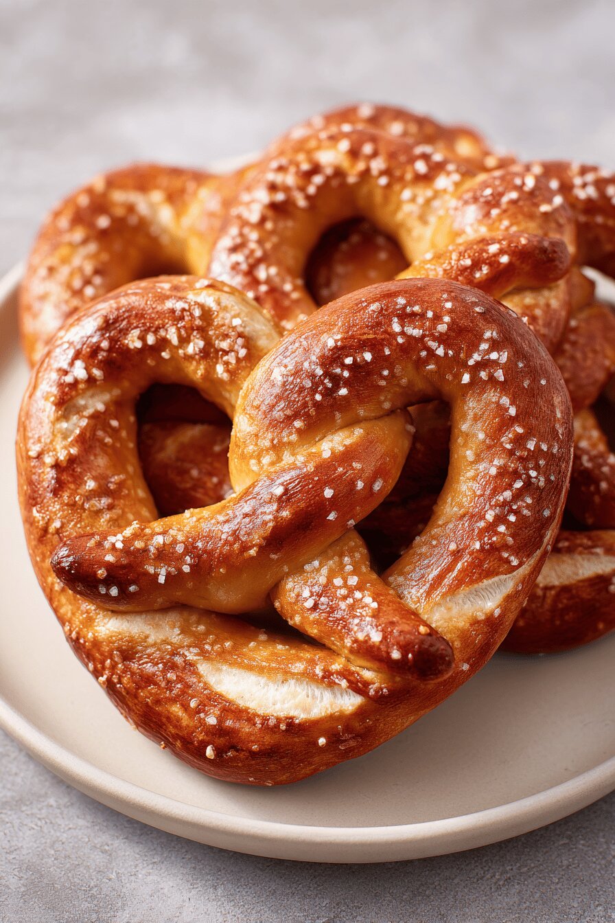 Yeast plus warm water starts activation. Stir gently, don’t mix too aggressively to preserve yeast bubbles. Flour added in parts helps control dough consistency for better kneading. Knead on clean, floured surface by folding over and pressing with palms, rotate dough ball. Form into smooth, firm ball to help rise evenly. Cover bowl with thin cloth, avoid airtight seal for slight airflow. Let dough swell until doubled; timing varies with warmth. Oven preheated to match boiling soda bath temperature. Roll dough into long thin ropes evenly to create uniform bretzels. Water bath with baking soda key—alkaline bath changes dough surface proteins forming that classic pretzel crust and flavor. Remove pretzels gently using slotted spoon or skimmer to avoid tearing. Arrange pretzels spaced apart on lined baking trays to avoid sticking. Salt generously before baking so it sticks to wet surface. Bake quick at very high heat to get crust without drying crumb. Serve warm for best taste and texture with dips.
