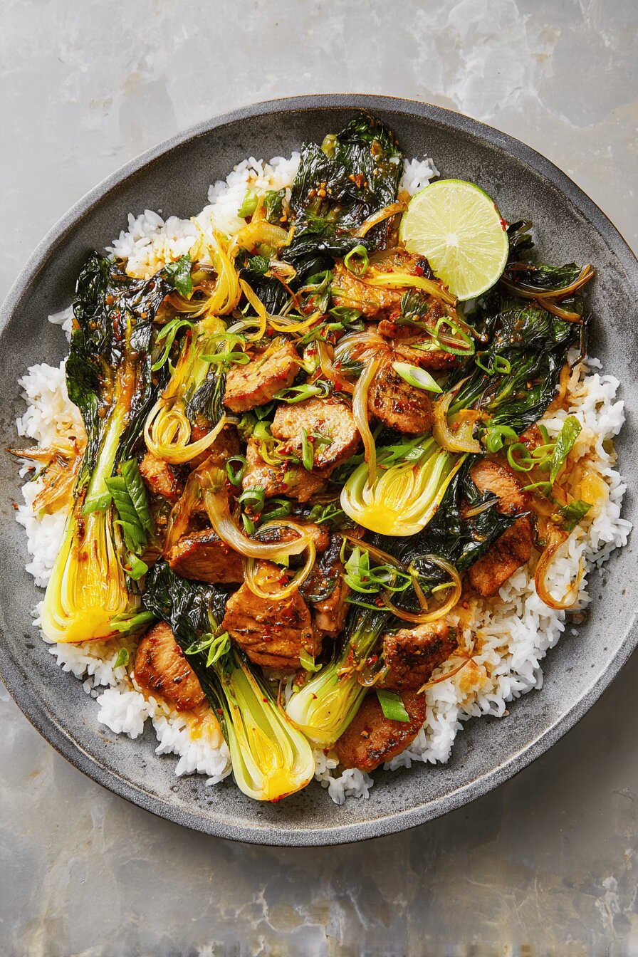 - 💡 Start bok choy prep first; steam or blanch 2 minutes max. Avoid soggy by quick drain, salt pinch after. Adds fresh crunch. Grilling bok choy works for smoky contrast but less bright. Watch pan temperature—if too low, pork poaches; too high burns edges. Listen for sizzle crackle, look for pale raw patches to go. Batch cooking key: no crowding keeps caramelization sharp. Sauce reduces till almost syrupy, coats spoon back.