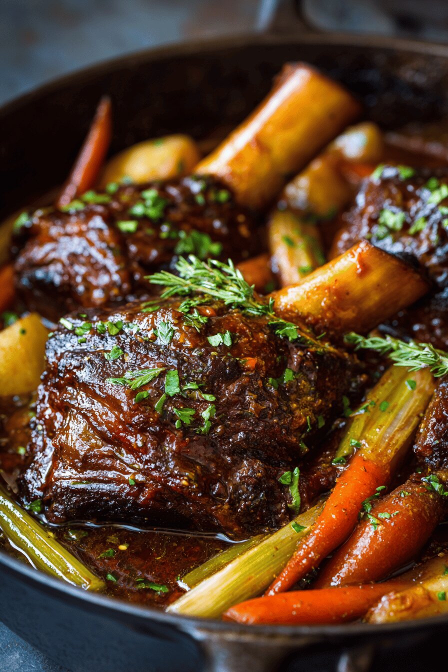 - Remove skillet, nestle carrots, celery, parsnips around shanks into liquid