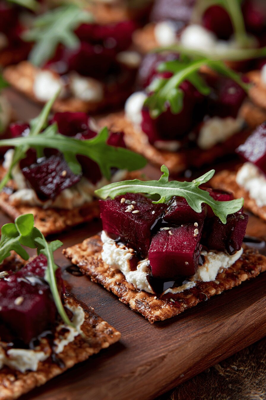 Bite-sized snacks with crunchy base, creamy cheese, earthy sweet beets, and a peppery green hit. Cheese melts quickly under high broiler heat, softening into the cracker without runoff. Beets pickled or marinated add color and tang; drain well to avoid sog. Maple syrup replaces standard honey for a deeper sweetness. Balsamic glaze dotted on top for surprise acidity, balances the rich goat cheese — unexpected twist. Arugula as a final pop of fresh green sharpness. Fast, visually striking, easy to assemble in minutes. Good for casual gatherings where finger food is needed. Mix textures, flavors, temperatures. Simple components transformed with small changes.