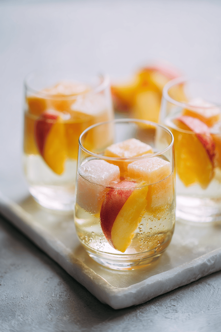 - Pour chilled wine into glasses over peach ice cubes if using. The cubes slowly melt, lending fresh peach flavor and mellowing cold sharp notes.