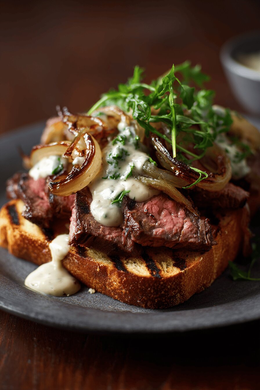 - Spread mustard cream sauce on grilled bread side generously, pile caramelized onions over two slices, add sliced steak, top with drained pickled fennel. Sprinkle fresh fennel fronds for aroma and texture. Close sandwiches, slice in half, serve immediately with extra pickles if liked.