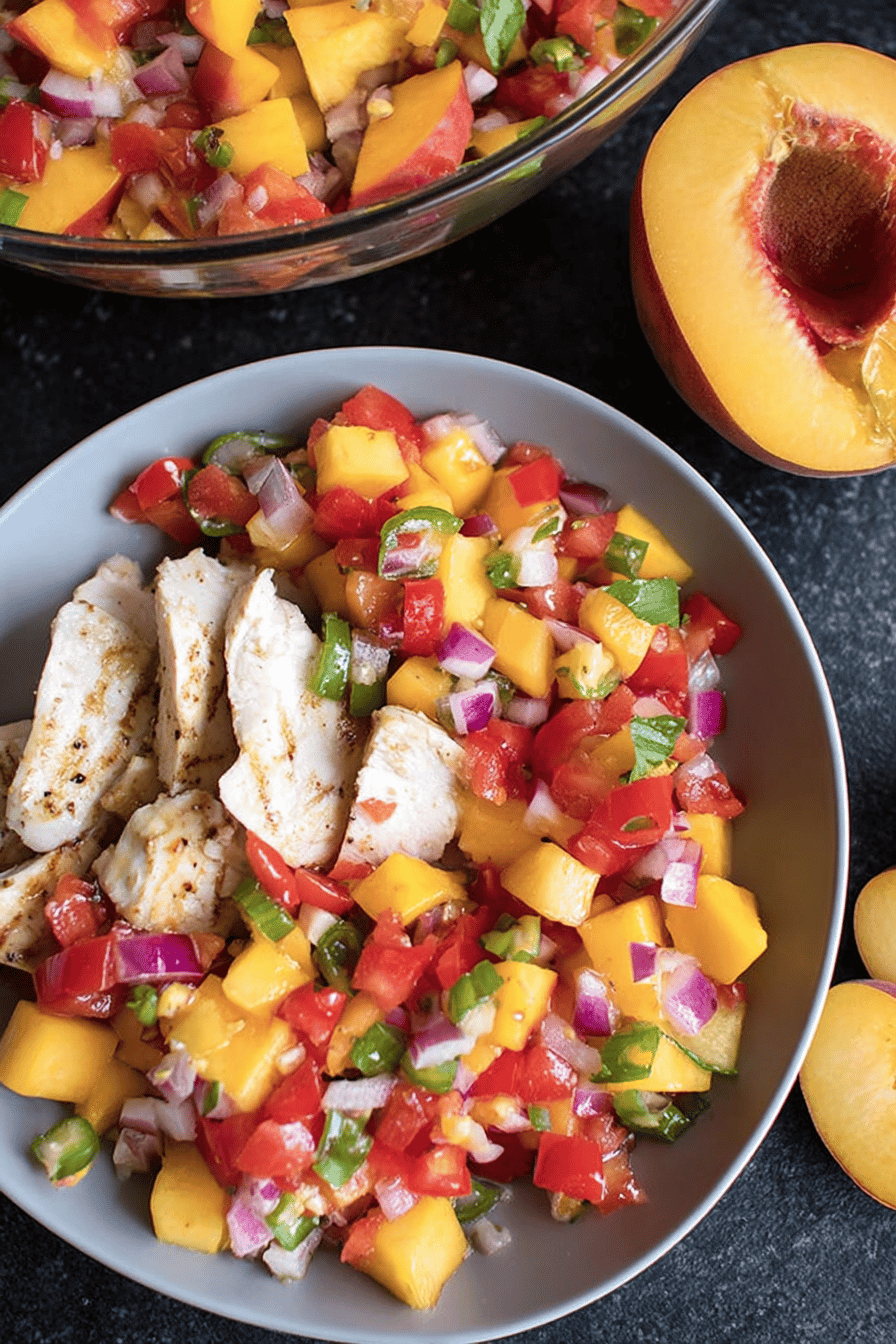 - 3 Plate chicken breasts. Spoon peach salsa over top just before serving. Salsa should glisten, fresh and colorful. The sweet heat from jalapeño with the tart snap of lime and apple creates a lively contrast over smoky meat.