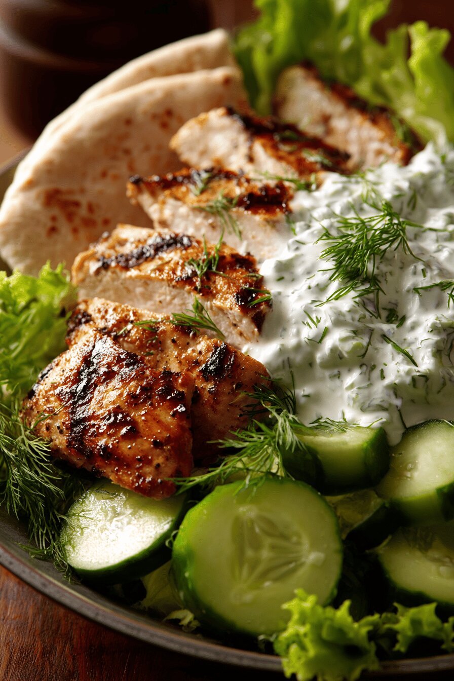 - 💡 Chop parsley fine, stir into sauce last; if overmix early herbal oils fade. Salt and pepper both on chicken and sauce; layers of seasoning. Lemon juice in sauce rather than chicken prevents drying. Pita breads toasted briefly if desired, adds warmth and slight crunch but skip if very fresh pita used. For kids, simple garlic lemon tzatziki avoids herb bitterness. Slice chicken thin so easier bite, avoid choking issue for little ones. Romaine leaves need crunch checks; limp or watery ruins texture balance. Cucumber batons about 3 inch long; easy to hold and dip.
